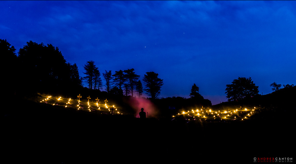 “(…) il sole tramonta su Bocchetta Paù, insellatura nelle Prealpi vicentine, 1286 metri sul livello del mare. Siamo sull’orlo meridionaleburning_cemetery_marco_canton_192 dell’altipiano di Asiago, o meglio, ‘dei Sette Comuni’. Per tutta la durata della Grande guerra, l’altopiano fu prima linea. Quarantuno lunghissimi mesi, quarantuno cimiteri di guerra censiti qui in zona, più di 59mila soldati sepolti, ma quello che vediamo è un altro cimitero, il quarantaduesimo, mai censito da nessuno perché non censibile: è apparso qui solo oggi. Le croci bianche sono centoquattro, di compensato. Presto andranno a fuoco, illuminando la sera.