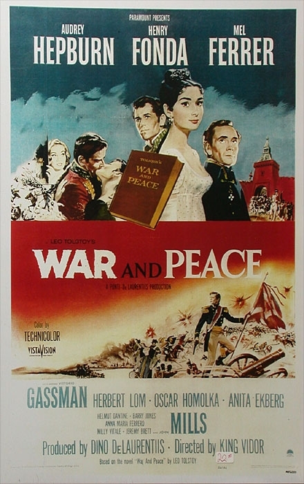 Prodotto a Cinecittà, regia di King Vidor. Molto apprezzato dalla critica, a mio parere, non vincolante, un orrore. Ricordo una delusione devastante: tagliata praticamente tutta la parte storica di un libro che non era riducibile, neppure per la ragazzina che allora ero, alle faccende, diciamo così, private e poco più dei protagonisti, con solo un pizzichino di guerra e un po’ di Napoleone. Ricordo male?