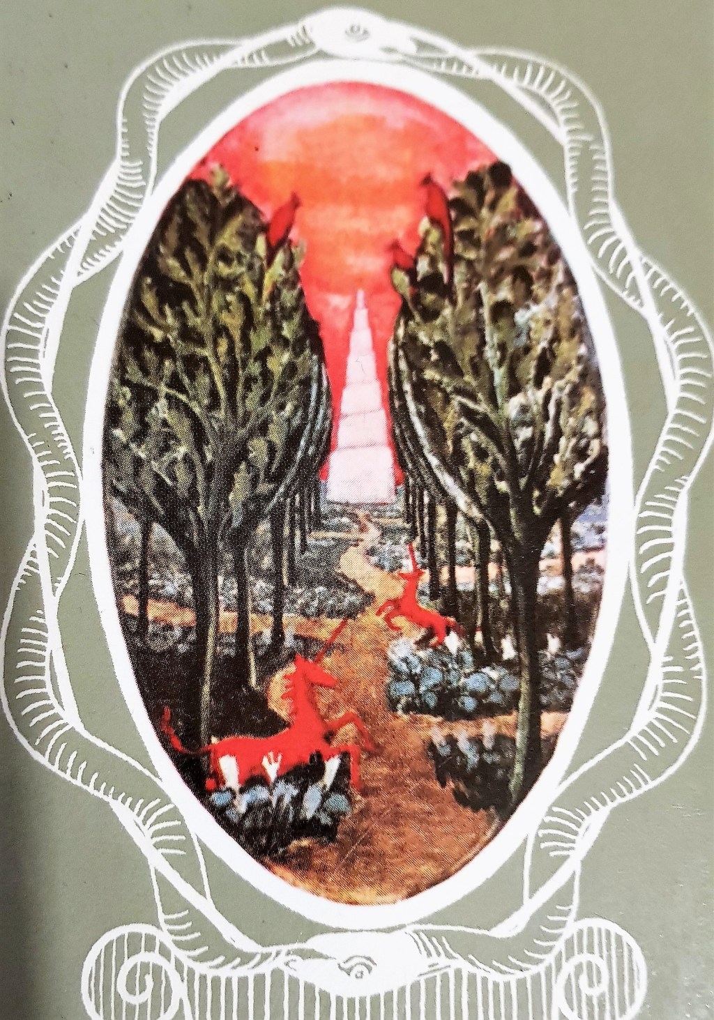 “Sollevò il libro e lo osservò da tutte le parti. La copertina era di seta color rubino cupo e luccicava mentre la rigirava di qua e di là. Sfogliandolo fuggevolmente vide che i fogli erano stampati in due colori diversi. Illustrazioni pareva non ce ne fossero, ma in compenso vi erano dei meravigliosi capilettera figurati”