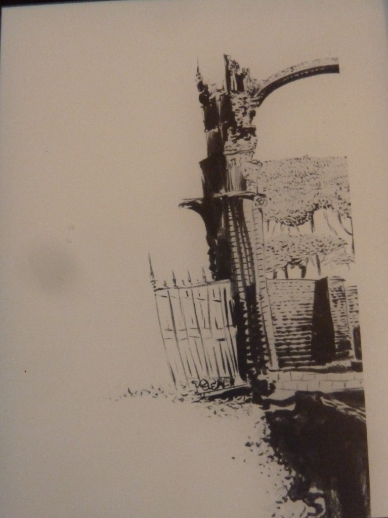 … “si vedevano la cappella funeraria abbandonata, i cancelli di ferro chiusi dal lucchetto, l’edera che si avviluppava intorno a una guglia, un alberello che spuntava da sopra le grondaie, all’altezza del tetto.