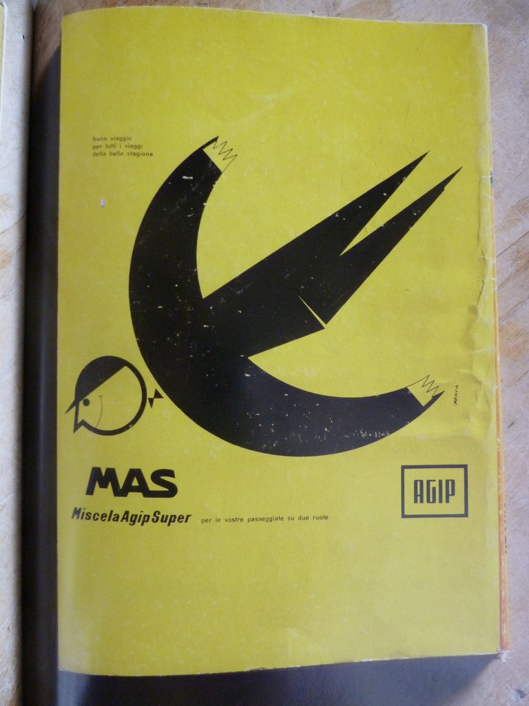 Ed ecco, in queste riproduzioni, apparire la quarta di copertina occupata dalla pubblicità dell’AGIP – per i troppo giovani AZIENDA ITALIANA GENERALE PETROLI – con il cane nero a sei zampe, su fondo giallo, che emette dalle fauci una fiamma rossa ancora oggi logo di ENI: Ente Nazionale Idrocarburi di cui l’AGIP, – Ente di fascista memoria – era allora il braccio operativo da riconvertire e aggiornare nella, diremmo oggi, Vision e nella Mission aziendali.