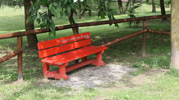 Red bench symbol against violence against women, Lombardy, Italy, 2024 – Written in Italian